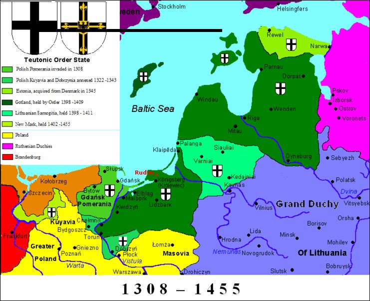 Państwo zakonu krzyżackiego z zaznaczeniem miejsca bitwy pod Rudawą; źródło: Wikipedia.