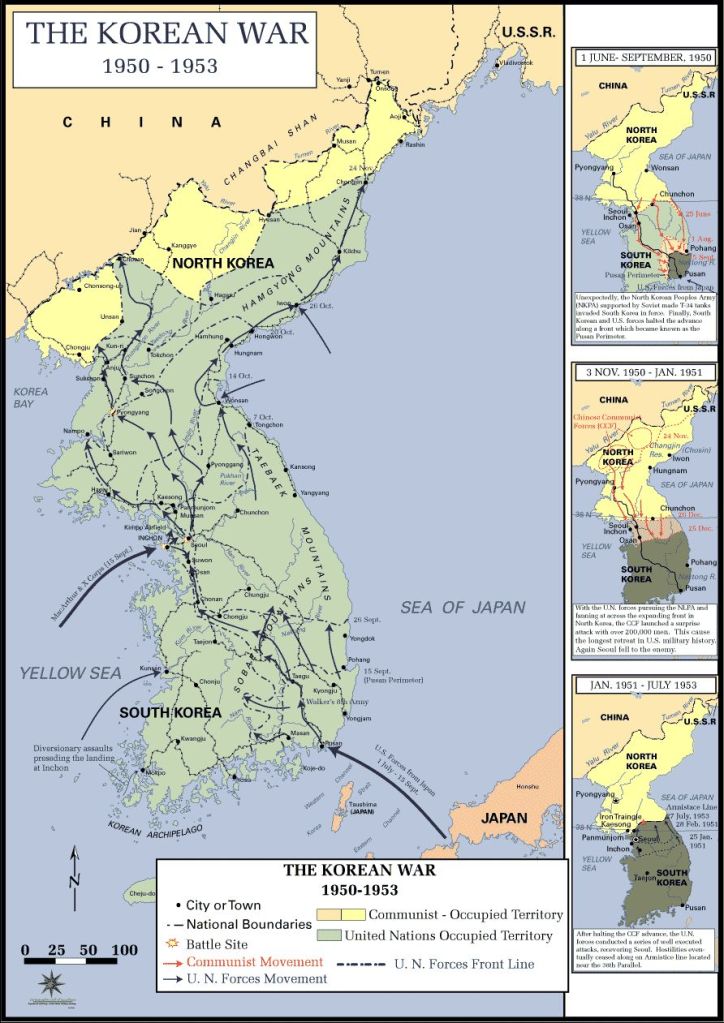 Na górnym małym zdjęciu wojska amerykańskie i północnokoreańskie zamknięte w tzw. worku pusańskim. Sytuacja z 5 września 1950 roku. Na dużym zdjęciu sytuacja z 25 października 1950 roku, gdy 90% Korei Północnej znalazło się pod okupacją amerykańską. Na środkowym małym zdjęciu sytuacja, gdy Mao wprowadza swoje wojsko i zajmuje w styczniu 1951 roku Seul. Na dolnym zdjęciu sytuacja, gdy po zmianie amerykańskiego dowództwa następuje odzyskanie Seulu i ustabilizowanie się linii frontu.