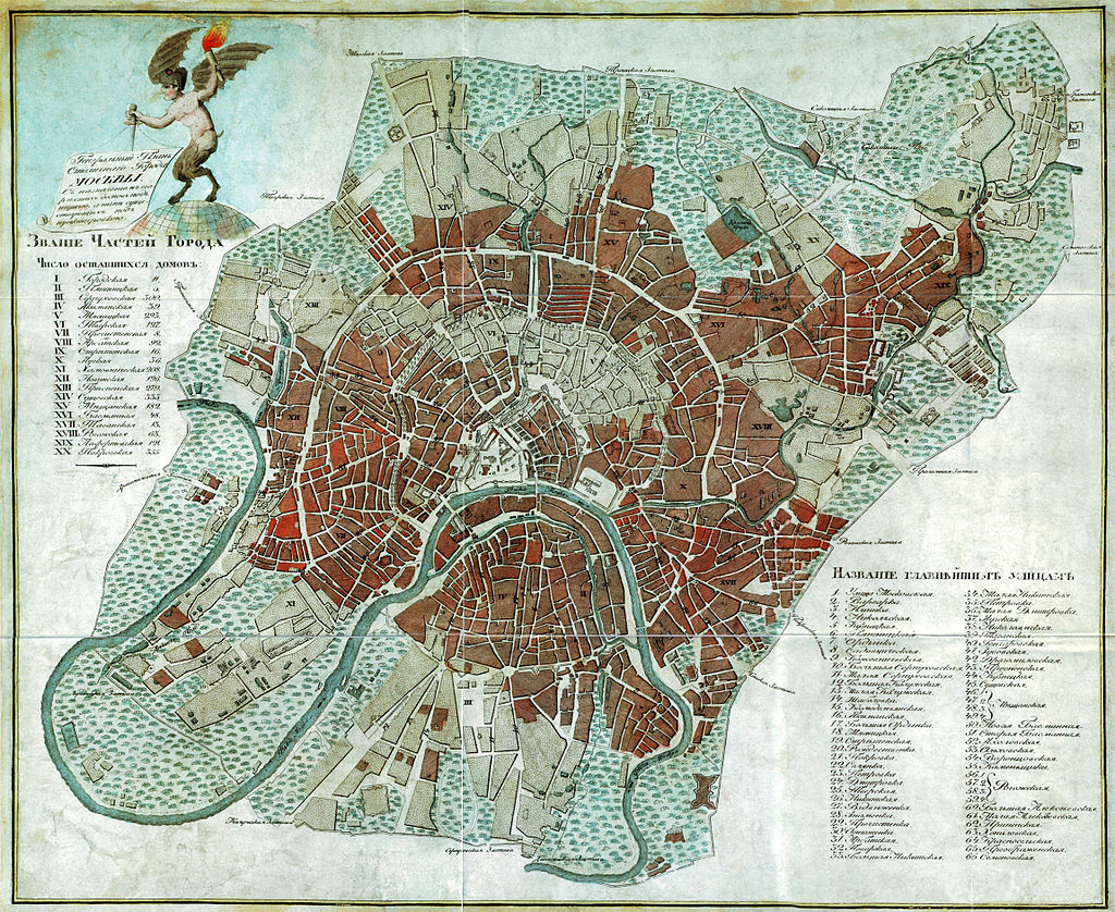Mapa Moskwy (wydanie 1813) – kolorem czerwonym zaznaczono dzielnice zniszczone przez pożar; źródło: Wikipedia.